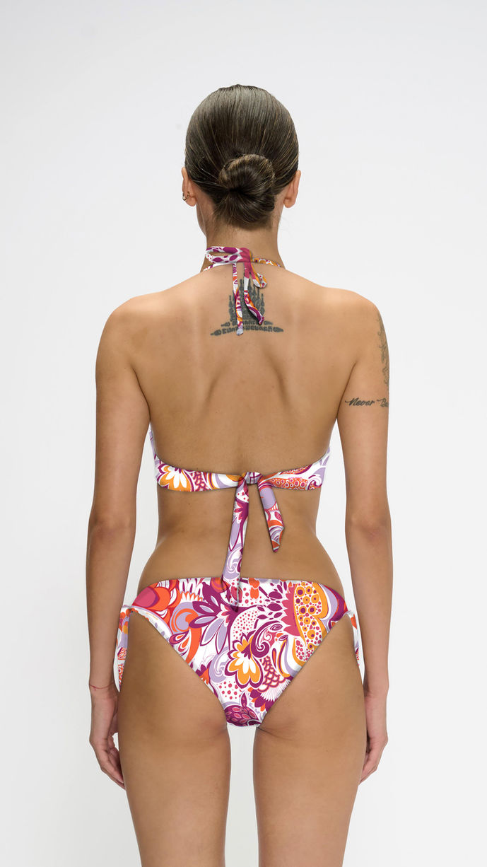 Bikini con coppe preformate, ferretto e push-up estraibili, pensato per valorizzare il décolleté con una scollatura profonda e femminile. Il reggiseno a triangolo è regolabile tramite laccio allacciato dietro al collo, mentre lo slip presenta fiocchi laterali che permettono di adattare al meglio la vestibilità sui fianchi. La stampa vivace all over, con motivi floreali e grafici a contrasto, dona al modello un carattere solare e sofisticato.