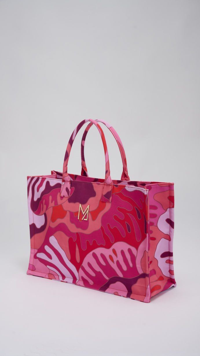Il tessuto in poliestere è interamente stampato con un pattern astratto nei toni vibranti del rosa, fucsia e corallo, che richiama onde e profili marini in chiave contemporanea. I manici rivestiti nello stesso disegno creano un effetto armonico e raffinato, mentre il logo “M” dorato al centro diventa un dettaglio gioiello discreto ma immediatamente riconoscibile.
